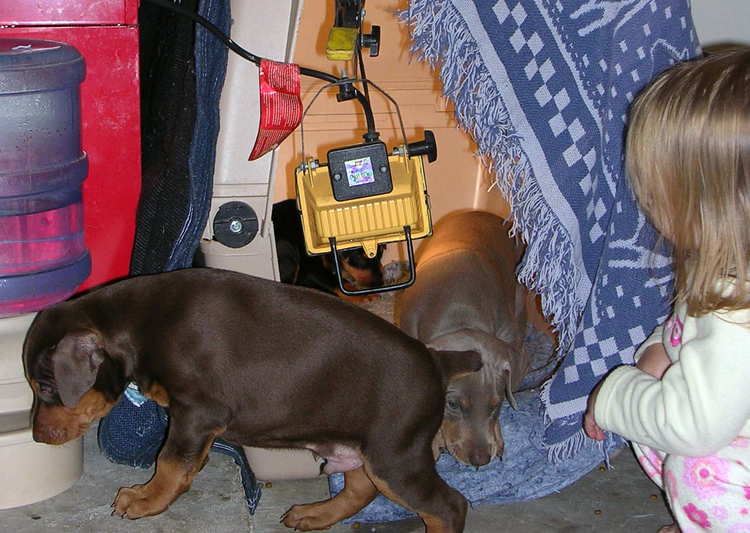 That is why you see the yellow heating lamp hanging from the crate. The pup in the picture above is Red Male.