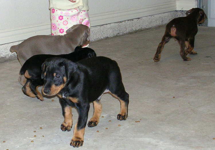 The picture below is not the greatest picture of the pups but it really shows a good comparison of the three coat colors - red, black and fawn.