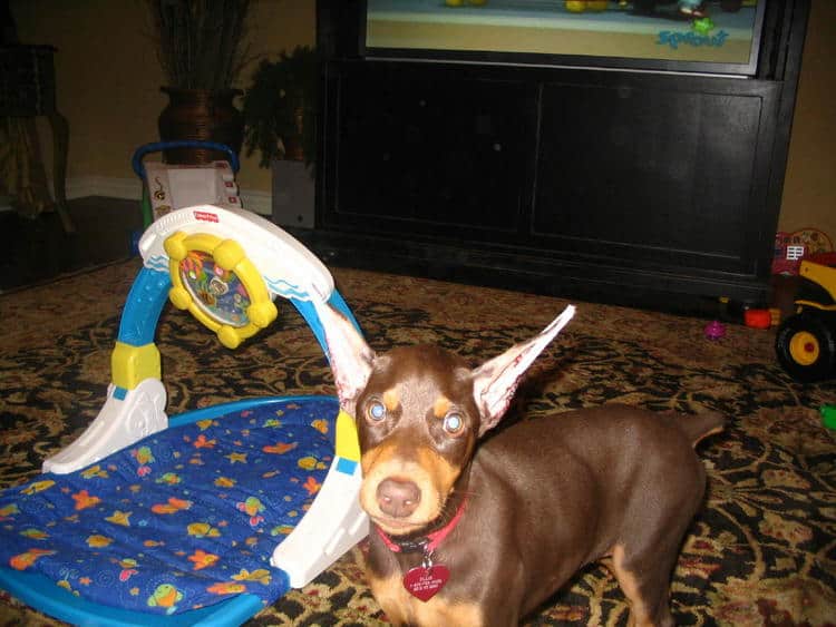 "I let them go home at 7 to 8 weeks old. The ear crop needs to be done by a vet that is good or you can ruin the look. Start looking in your area for a vet so you have the follow up care with the same person that does the ears. If you can't find one you are comfortable with doing the crop, I can take her to our vet - $350. As long as the pup is 10 pounds, she is fine with doing the ears at 7 weeks old. But, you would still have to find someone to wrap the ears."