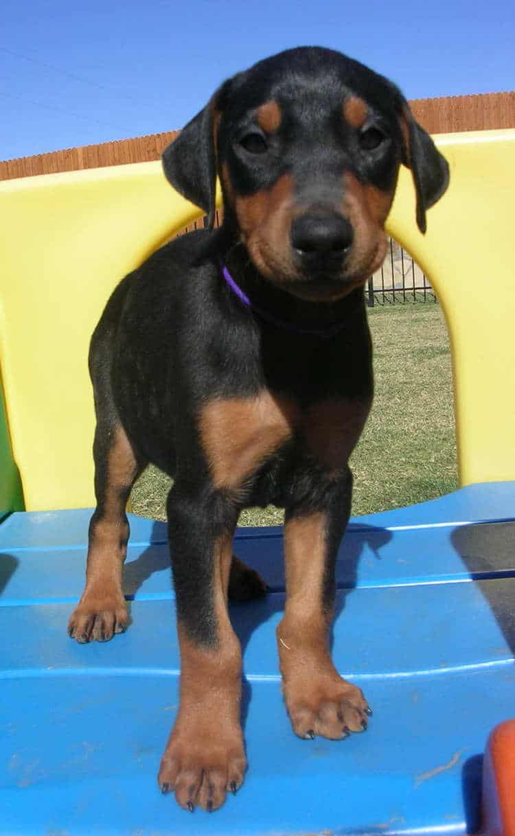 "That is wild! Our dogs definitely "read" me. But, we don't have enough uninvited strangers around to really test them. And, we have them so "trained" to put on a good show for potential dobe owners that they just demand love from seems whoever walks in the door. But, I witness them out in the backyard and they go nuts when workers are on the other side. I honestly, I don't know what I would do without my dogs giving the feeling of protection. Rare ocassion the other night, I came home alone (almost never happens -- left kids with dad at soccer practice so I could come home and paint) and I practically ran to the back door to let the dogs in! Once they were in, I went back to being relaxed and went about my business without a second thought. But, before they were in, I was a little creeped out! That feeling probably comes indirectly from my husband. Everytime we sit down to watch a movie where something happens on the domestic home front, he says, "You know, none of this would have happened if they just had a Doberman." Ha! Ha! Oh well -- Thanks for emailing back. I am always curious how everything is going. I couldn't be more pleased with the owners of this litter. Thanks for providing him such a good home! All the best, Laura"